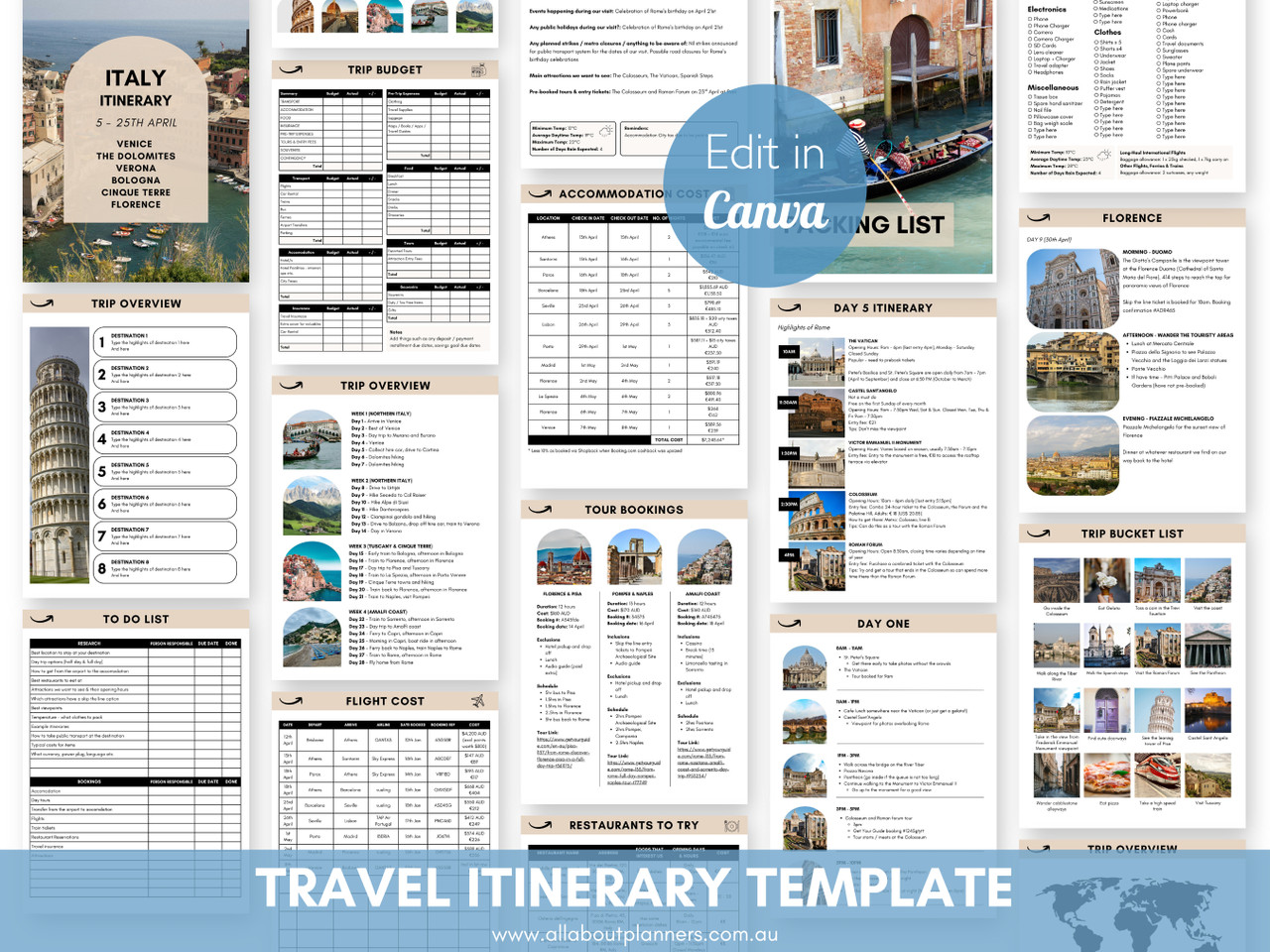 - Travel Itinerary Template (fully editable and customisable in Canva)